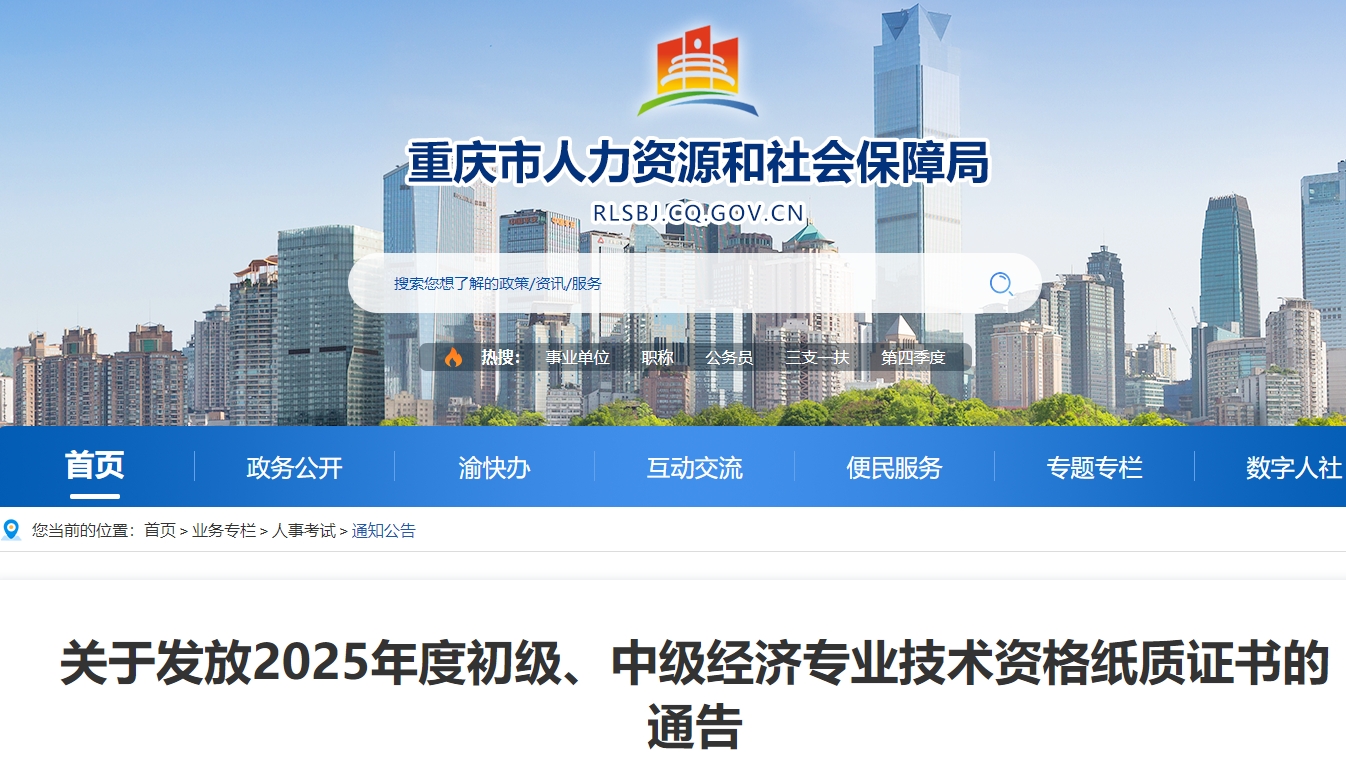 重庆市2025年中级经济师纸质证书发放工作已启动。考生可通过两种方式领取:一是证书邮寄,需在2026年1月7日至20日扫描官方二维码登记收件信息,证书将于1月23日起陆续通过EMS寄出,邮费到付;二是现场领取,时间为2026年1月26日至2月12日的工作日,考生需携带本人身份证原件前往重庆市人事考试中心(两江新区春华大道99号2号楼2210室)办理。