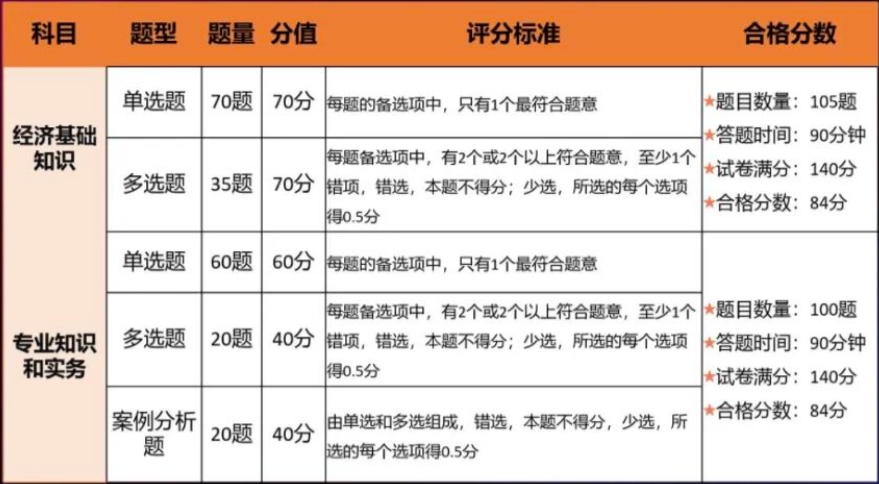 中级经济师考试题型均为客观题(选择题),包括单选题、多选题及案例分析题。两科满分均为140分,全国统一合格标准为84分。