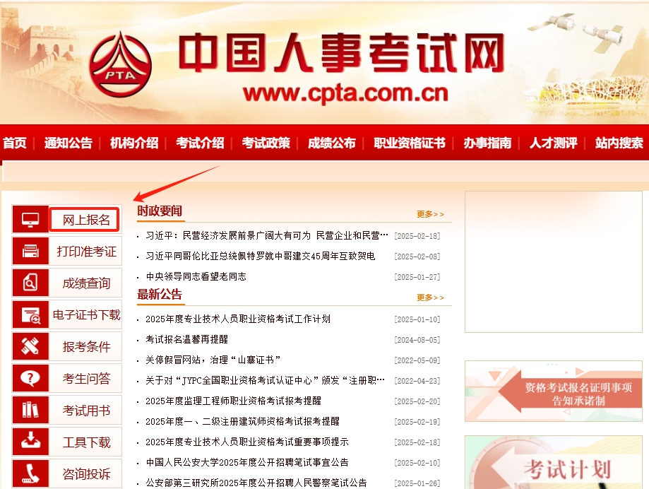 报名唯一官方入口:中国人事考试网(www.cpta.com.cn),通过“全国专业技术人员资格考试报名服务平台”操作。请认准官网域名,警惕虚假链接。