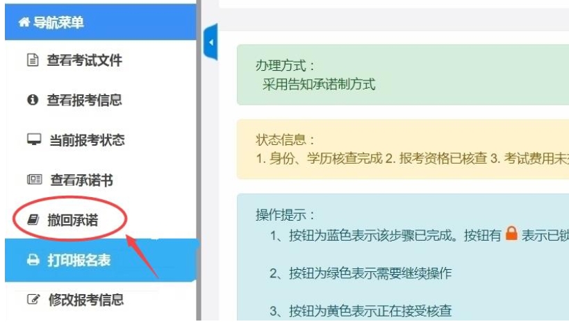 2.考生打印的“报名表”供报考人员留存备查。报考人员作出承诺后,如未交费,可在报名截止前撤回承诺。一旦撤回承诺,本年度该项考试不再适用告知承诺制。