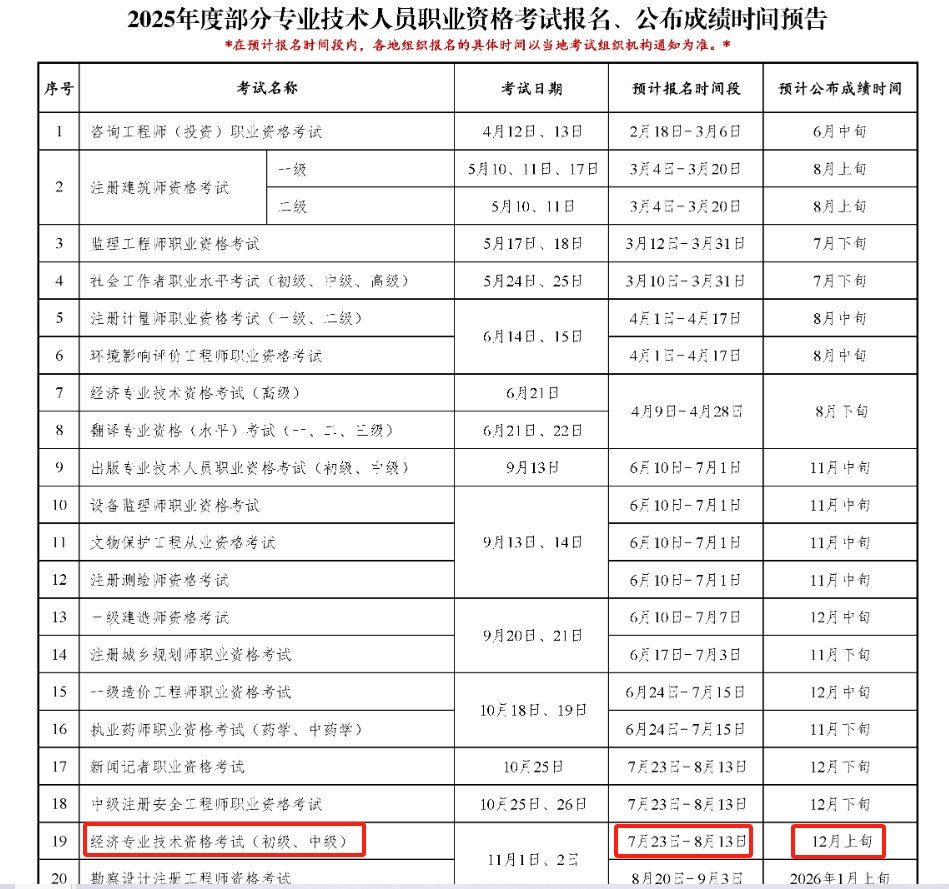 根据中国人事考试网发布的《2025年度专业技术人员职业资格考试重要事项提示》,2025年中级经济师考试的报名时间预计为7月23日至8月13日,考试时间已确定为11月1日和2日,成绩预计将在12月上旬公布。考生们需密切关注这些时间节点,确保不错过任何重要信息。