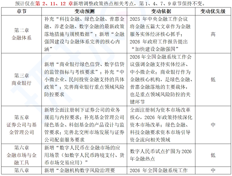 根据优路教育等机构的考纲变动分析,2026年金融专业考试大纲预计变动幅度约为12%,是十大专业中变动较大的科目之一。