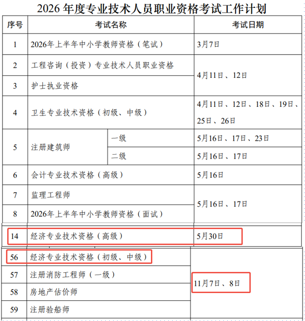 根据人力资源社会保障部办公厅发布的《2026年度专业技术人员职业资格考试工作计划》,2026年中级经济师考试时间确定为11月7日-8日。这是官方正式公布的工作安排,标志着2026年考试工作正式启动。