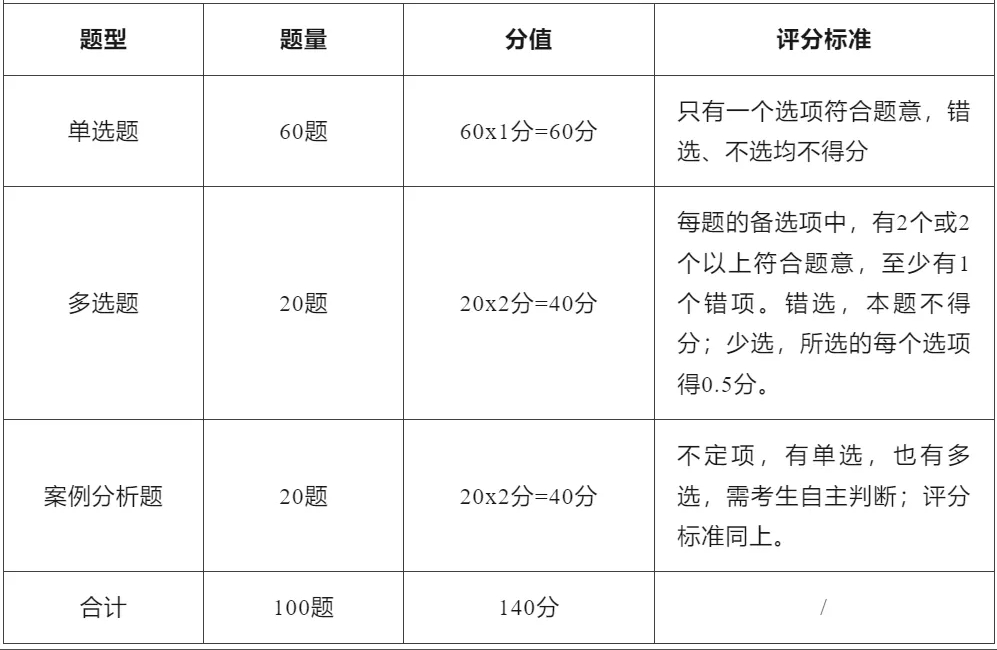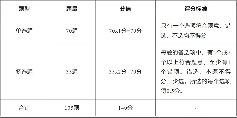 多选题(35题,每题2分):需特别注意评分规则——错选不得分,少选每选对一项得0.5分。例如,正确答案为ABC,选择AB得1分,选择ABD则本题不得分。