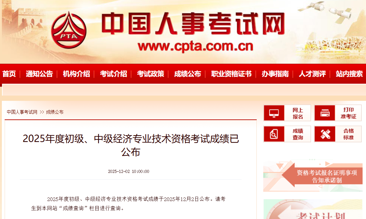 登录唯一官方网站(www.cpta.com.cn),点击首页“成绩查询”栏目,使用报名账号和密码登录后,选择“2025年度经济专业技术资格考试(初中级)”,即可查看成绩详情。