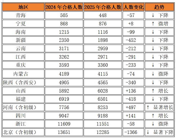 从已公布的15个地区数据看,北京、浙江、四川、河南四地构成了合格人数的“第一梯队”。北京2024年合格人数13651人,2025年12285人,虽略有下降但仍稳居榜首;浙江两年均保持在1.15万人以上,竞争激烈程度可见一斑。