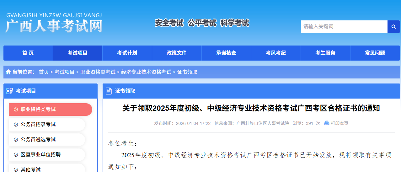 2025年度初级、中级经济专业技术资格考试广西考区合格证书已开始发放,现将领取有关事项通知如下: