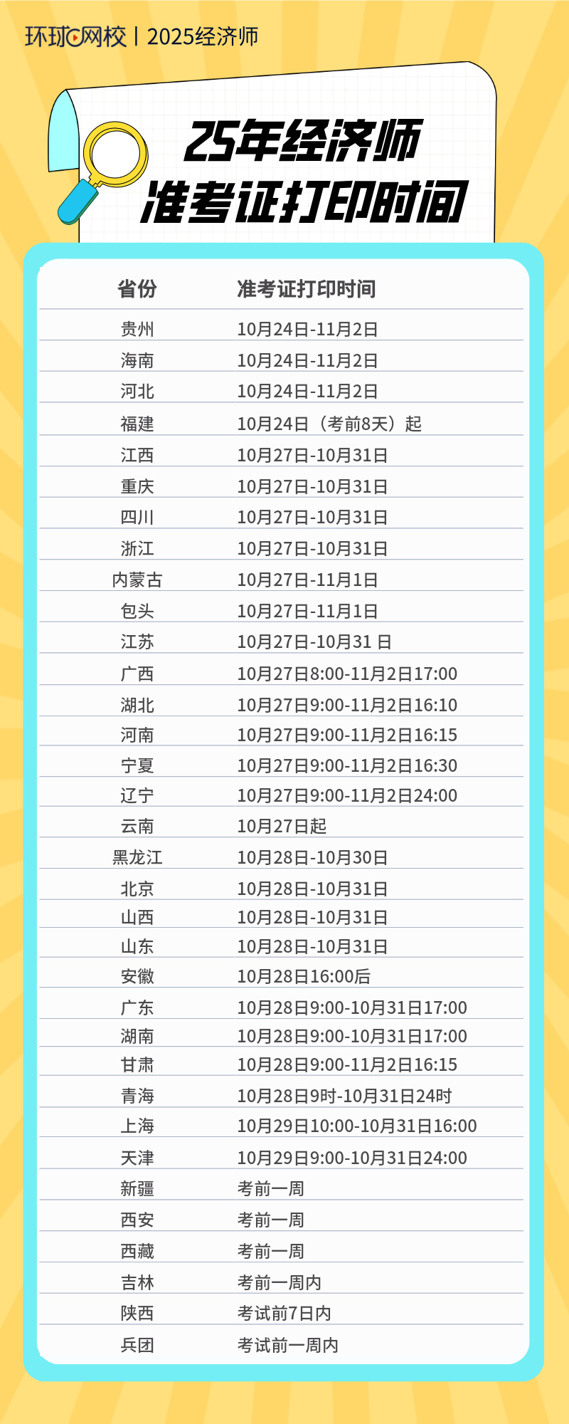 2025年中级经济师准考证打印入口开通时间因省份而异,具体安排如下: