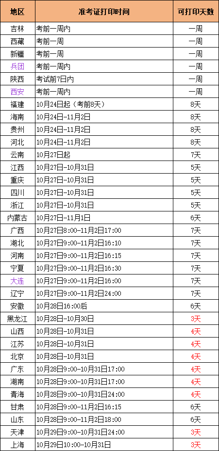 - 云南、江西、重庆、四川、浙江:打印时间为10月27日至10月31日,仅5天,请务必提前完成;