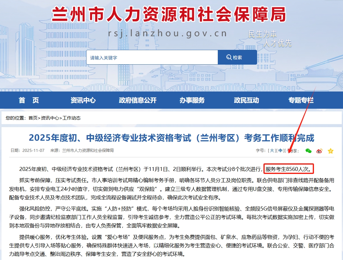 2025年度甘肃兰州初中级经济师考试参考人数为8560人次,较2024年的10748人次下降20.36%,引发广泛关注。这一数据来自兰州市人力资源和社会保障局11月7日发布的官方公告,反映了当地专业技术人才考试的最新动态。