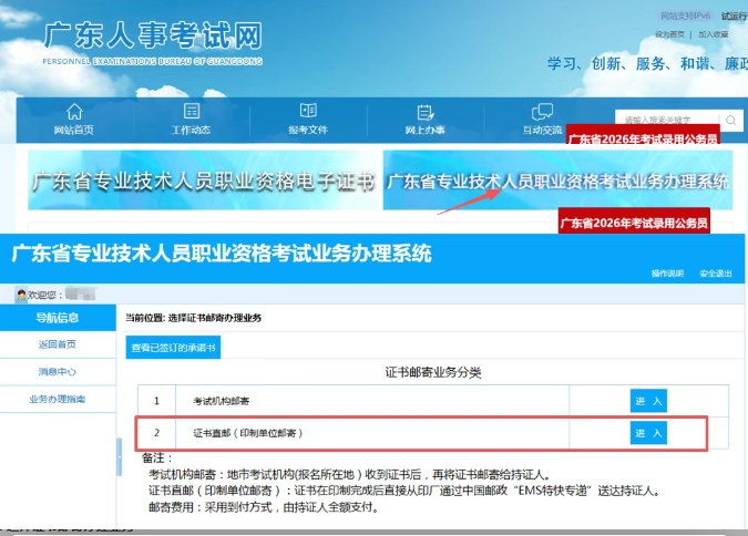1)全科成绩合格考生可登录广东人事考试网--“广东省专业技术人员职业资格考试业务办理系统”(以下简称“系统”),在首页选择证书邮寄模块,点击“证书直邮”栏目填写邮寄信息提交证书直邮申请。(提交申请前请核对邮寄信息确保准确无误,需填写常用的手机号码并确保畅通,用以接收投递验证码签收证书。如填写手机号码有误,将无法签收证书。)