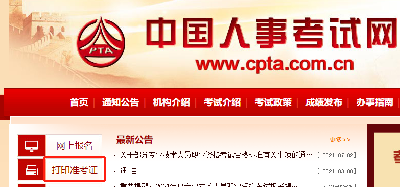 1.进入“中国人事考试网”,左侧找到【打印准考证】,并点击进入。