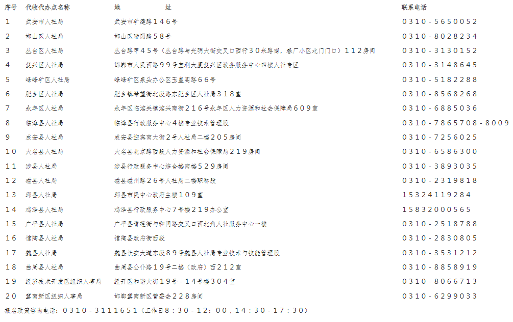 上述报考人员持有关材料,于9月5日-6日,按照“就近办”原则到各县区人力资源社会保障部门代收代办点进行现场人工核查(详细地址见下表)。现场审核后及时查看审核状态,显示“通过”后完成网上缴费后即完成报名。