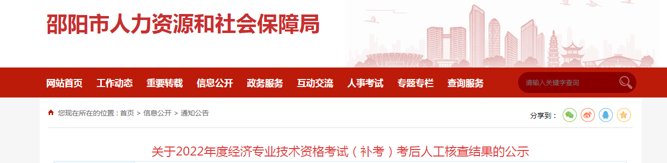 根据湖南省人力资源和社会保障厅《关于2022年度经济专业技术资格考试(补考)考后人工核查公告》要求,经审核,现对邵阳市2022年度经济专业技术资格考试(补考)考后人工核查结果以及报名服务平台核验通过的成绩合格人员名单予以公示,公示期为2023年5月22日至2023年5月26日。