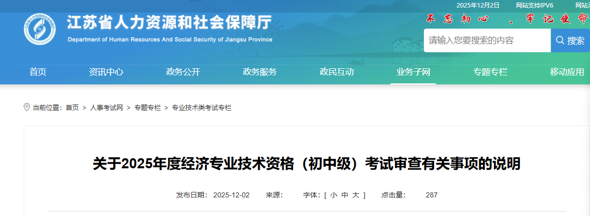 根据《江苏省人力资源社会保障厅关于进一步加强专业技术人员资格考试审查工作的通知》(苏人社发〔2018〕383号)、省人力资源社会保障厅《关于做好2025年度初级、中级经济专业技术资格考试工作有关事项的通知》(苏人社函〔2025〕193号)文件规定和要求,现就做好2025年度经济专业技术资格(初中级)考试考后资格审查工作有关事项通知如下: