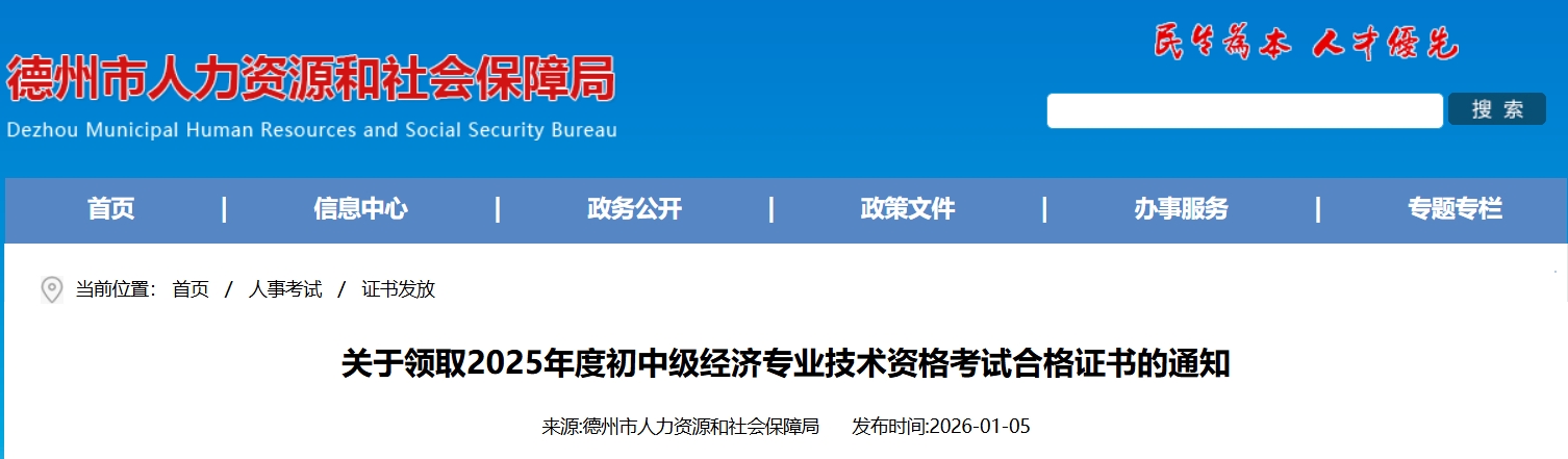 2025年山东德州中级经济师证书已开始发放。领取方式包括邮寄和现场领取两种:邮寄申请时间为2026年1月5日至4月5日,可通过"山东人事考试信息网"或"爱山东"APP办理,邮费省内12元/件、省外21元/件;现场领取时间为工作日上班时间,地点为德州市天衢新区国防路1001号。