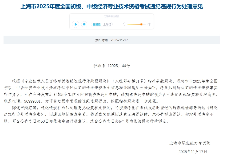 近日!上海市人社局发布《2025年度初级、中级经济专业技术资格考试违纪违规行为处理意见》,6名考生当次该科目成绩无效处理!