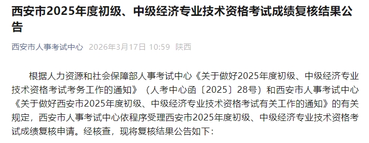 2026年3月17日,西安市人事考试中心正式发布《西安市2025年度初级、中级经济专业技术资格考试成绩复核结果公告》。根据公告,西安市人事考试中心依程序受理了2025年度经济师资格考试成绩复核申请。经相关部门核查,所有申请复核的34名考生成绩均无误,复核结果已通过官方渠道告知申请人。