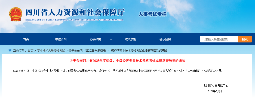 2025年度初级、中级经济专业技术资格考试,成绩复查结果现已公布,请各位考生从四川省人力资源和社会保障厅官网“人事考试”专栏进入“查分申请”栏查看复查结果。