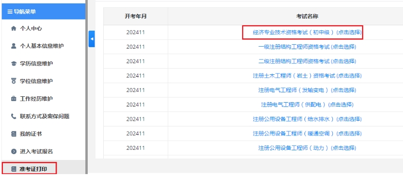 第2步:输入用户名、密码登录系统,点击左侧导航菜单【准考证打印】;