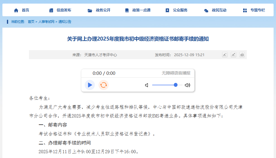 为满足广大考生需要,减少考生往返路程和排队等候,中心与中国邮政速递物流股份有限公司天津市分公司合作,开通2025年度我市初中级经济资格证书邮政EMS寄递业务。