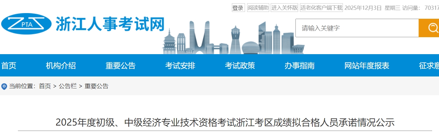 12月3日,浙江人事考试网发布了《浙江人事考试网2025年度初级、中级经济专业技术资格考试浙江考区成绩拟合格人员承诺情况公示》,从中得知,浙江2025年中级经济师考试合格人员名单公示期为12月3日-12月16日,名单在附件中,大家可下载查看!