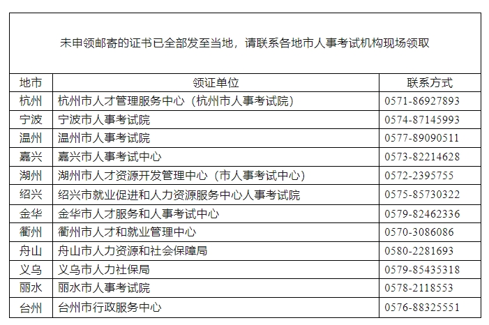 浙江按考生报名时选择的考区发放证书,不可跨区领取。登录"浙江人事考试网"→"合格证书"栏目,或拨打以下电话咨询具体安排: