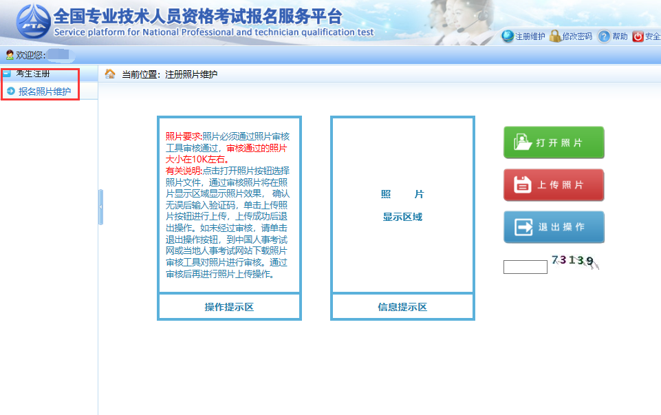 注册完成后,重新登录,并点击左侧“报名照片维护”菜单,进入上传照片页面。