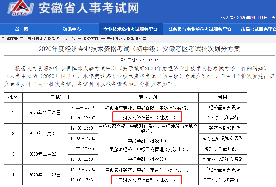 近日,安徽省发布了《2020年度经济专业技术资格考试(初中级)安徽考区考试批次划分方案》,对经济师考务事宜进行安排,将2020年度经济专业技术资格考试分2天上、下午4个批次实施。其中人力资源管理、金融、工商管理专业分为两个批次。中级人力专业考试将于11月21日上午和11月22日下午举行。