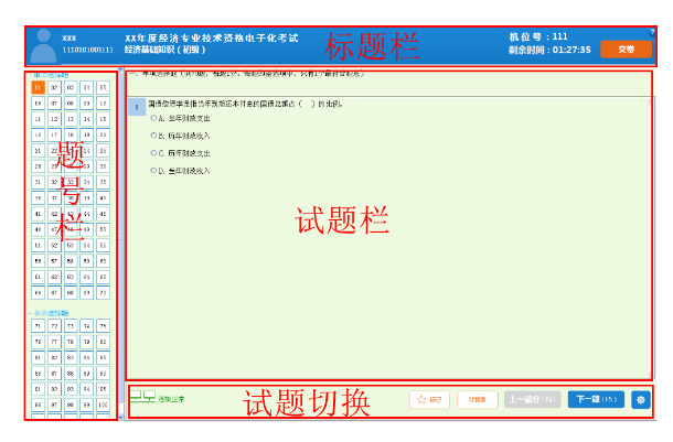 标题栏从左到右,依次显示应试人员基本信息、本场考试名称、考试科目名称、机位号、考试剩余时间、“交卷”按钮。