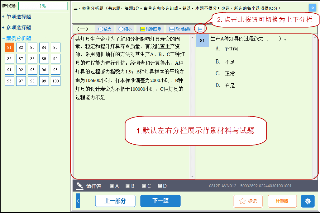 1. 界面分栏:案例题支持左右分栏和上下分栏切换,方便阅读材料;