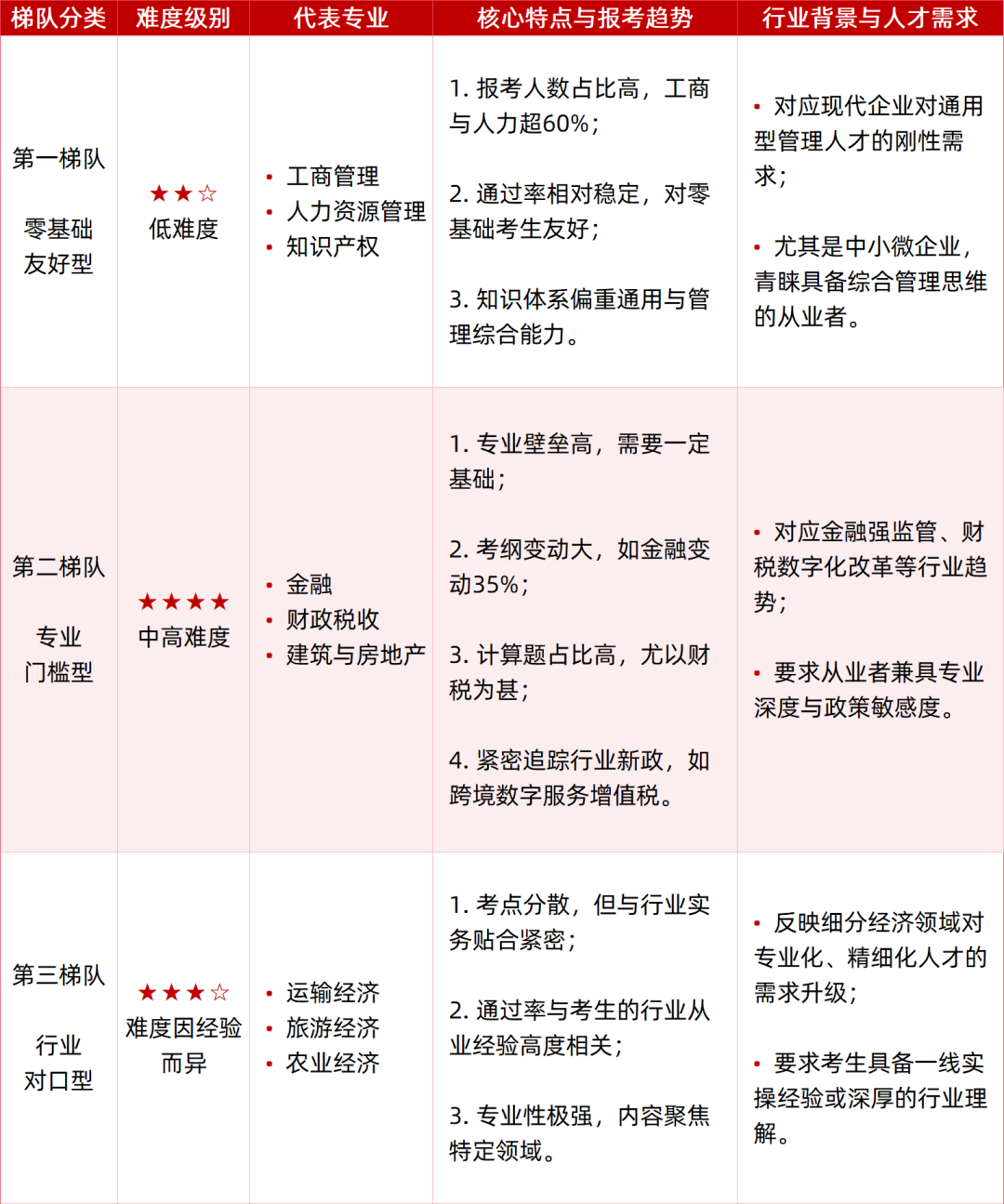 根据殷巧玲老师的专业分析,2025年中级经济师十大专业将呈现明显的难度分化趋势,按照考试特点和行业需求可分为三个梯队。2025中级经济师专业难度分化:十大专业分三梯队报考指南,本文将为不同背景的考生提供针对性的专业选择建议,帮助大家根据自身情况做出最优决策。
