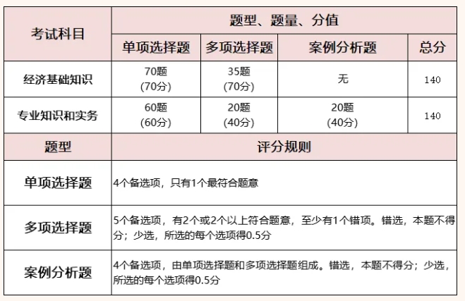 《经济基础知识》:公共科目,满分140分,84分及格。考试时长90分钟,题型为单选70题(70分)、多选35题(70分)。内容涵盖经济学、财政、货币金融、统计、会计、法律六大模块,知识点广但深度适中。