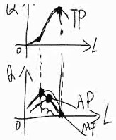 根据MP曲线的图形可以给出TP曲线。总产量曲线先以递增的速度上升(此时MP递增),后以递减的速度上升(此时MP下降,但MP>0),总产量达到最大值后下降。