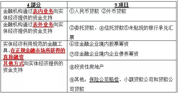 【解析】考查货币供给与货币供应量。社会融资规模统计指标主要由四个部分构成。